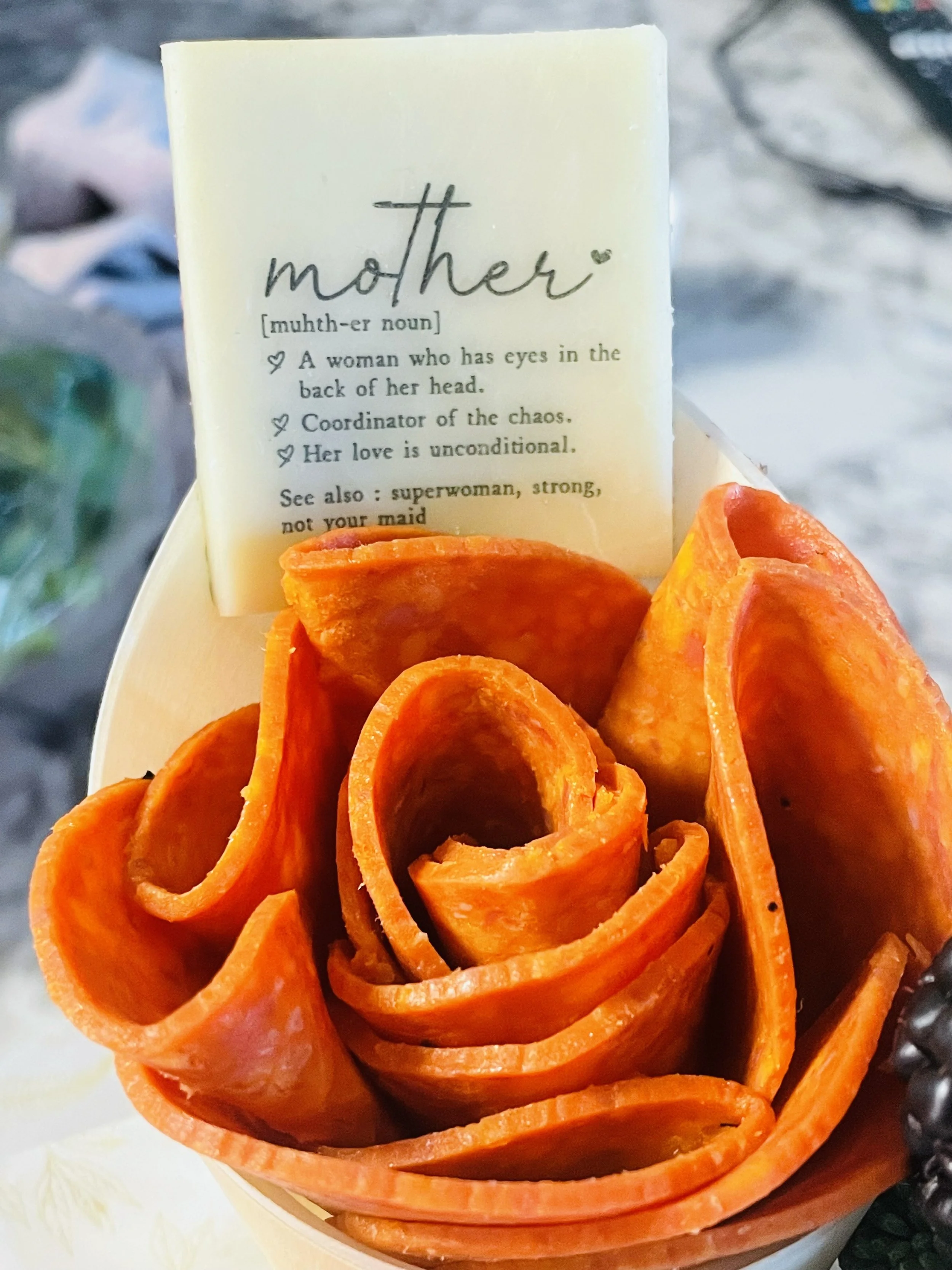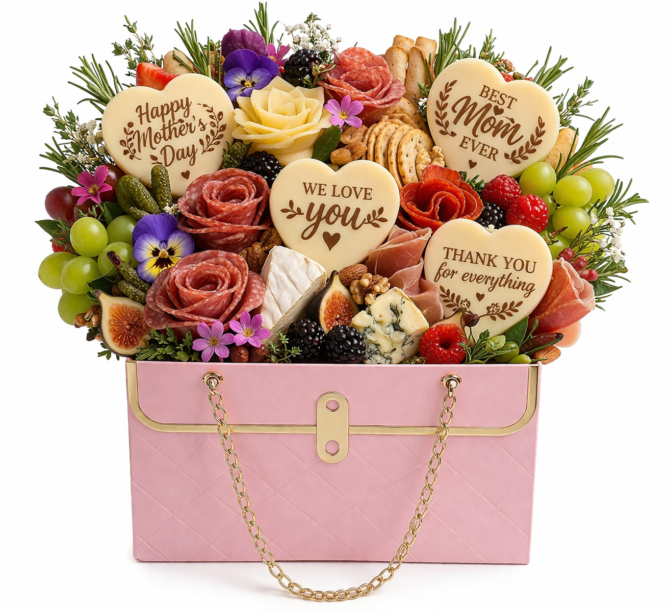 A stunning, one-of-a-kind edible gift filled with premium meats, cheeses, fresh fruits, crackers, and sweet touches—featuring our signature custom printed Mother’s Day cheese 💕